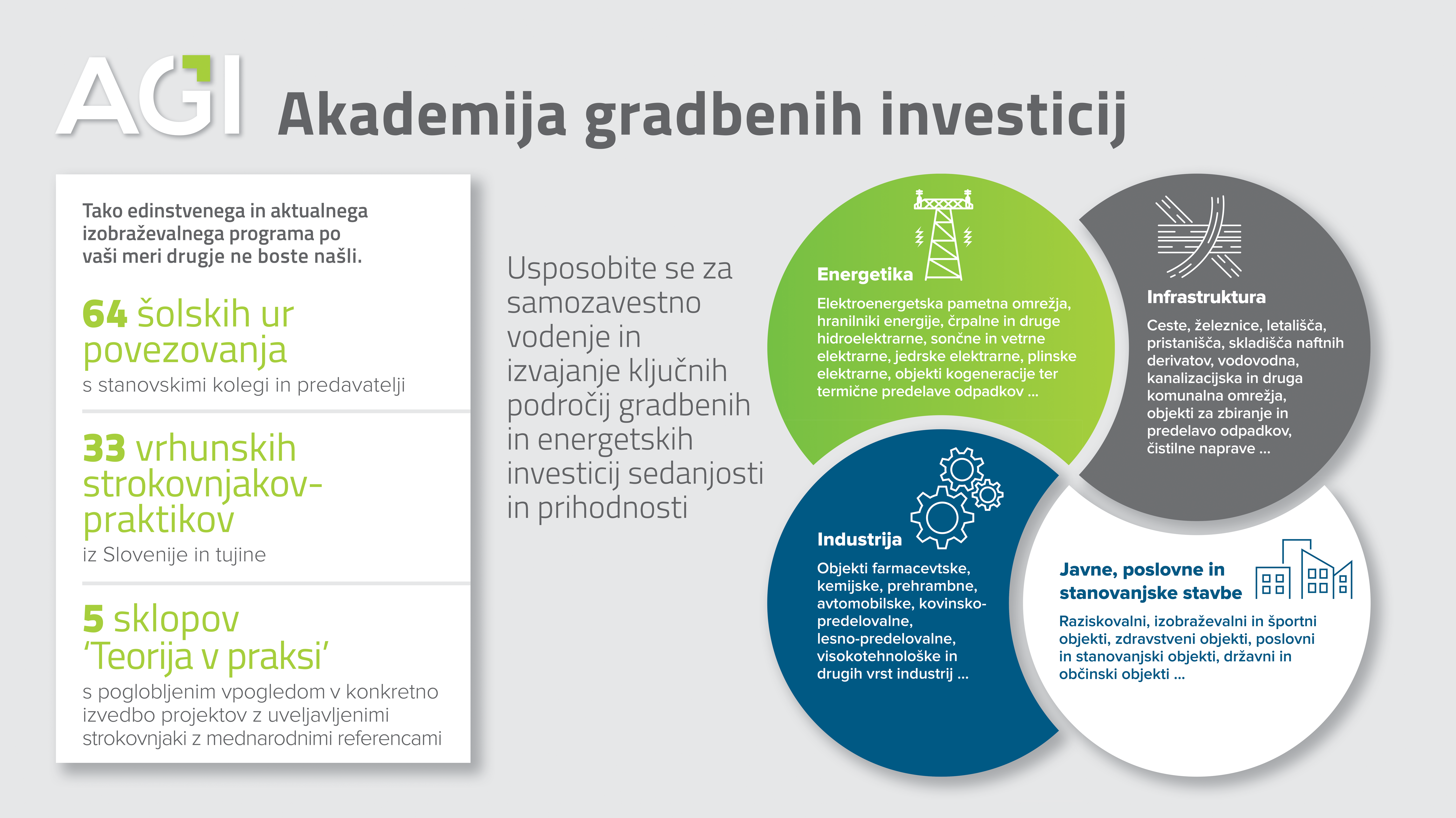 Akademija gradbenih investicij (AGI) je edinstvena šola za vodenje in izvajanje investicij, ki jo Združenje za svetovalni inženiring pri GZS izvaja že od leta 2018.