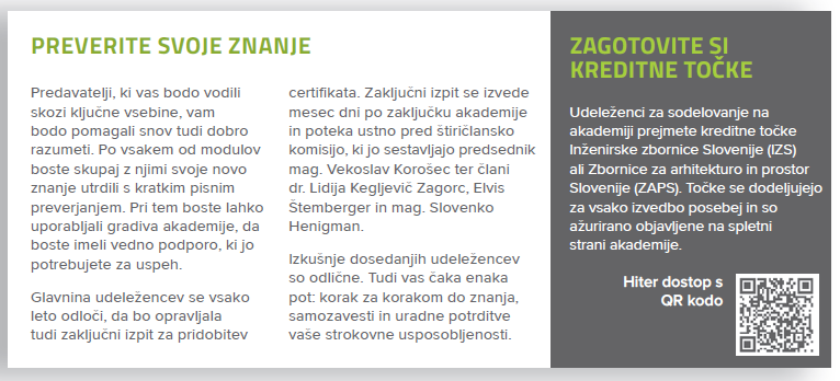 Udeleženci akademije pridobite tudi kreditne točke Inženirske zbornice Slovenije (IZS) ali Zbornice za arhitekturo in prostor Slovenije (ZAPS).